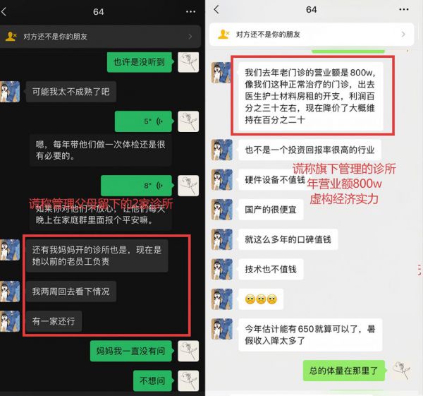 【编造虚假经济能力】:谎称独自管理父母留下的两家年入千万的诊所及父母遗产,编造虚假经济能力;