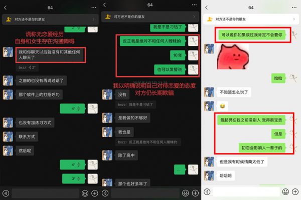 【编造纯情人设】:以因与女性沟通存在严重障碍导致无任何恋爱经历,打造纯情人设进行情感欺骗。