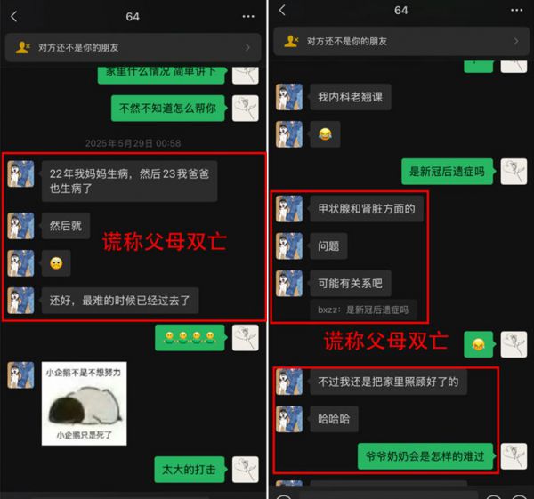 【悲情人设编造】:虚构父母于2022、2023年分别因淋巴疾病、肾衰竭去世的惨状,谎称家中有不成器的弟弟需要自己独自照顾,同时捏造自己患有创伤后应激障碍(PTSD),靠“悲惨经历”博取女生共情;